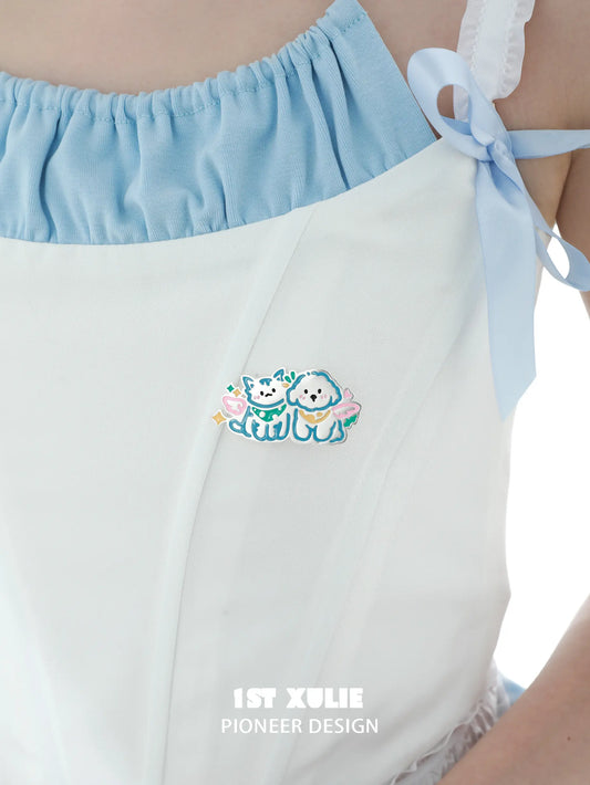 "Angel Cuties" Platinum Plated Hand-Painted Kitten & Puppy Duo Brooch, Cute Animal Pin