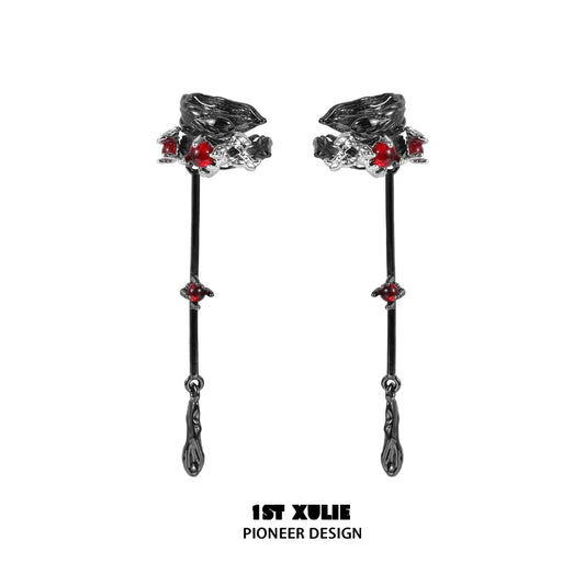 "Taboo Rose" Platinum Plated Gothic Rose Pendant Ear Clips, Dangle Ear Cuffs