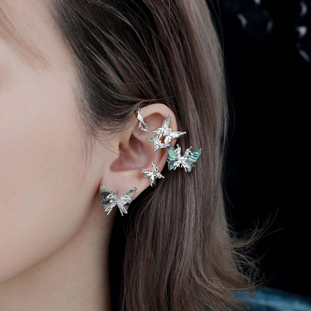 • Inspired by the surreal beauty of the "Butterfly Wasteland" collection, these earrings capture the enchanting image of a butterfly in flight. The large, intricate wings are inlaid with iridescent abalone shell, reflecting a captivating spectrum of colors with every movement.