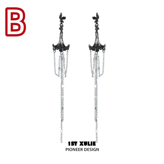 "Frozen Serpent Girl" Platinum Plated Statement Sword Chain Dangle Stud Earrings