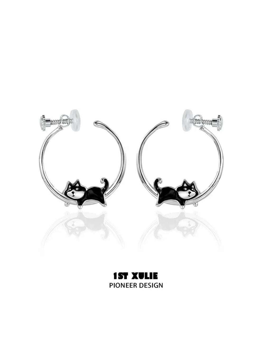 1ST XULIE "Graffiti Puppy" Playful Lazy Husky Dangle Earrings in Platinum Plated - Styled Product View